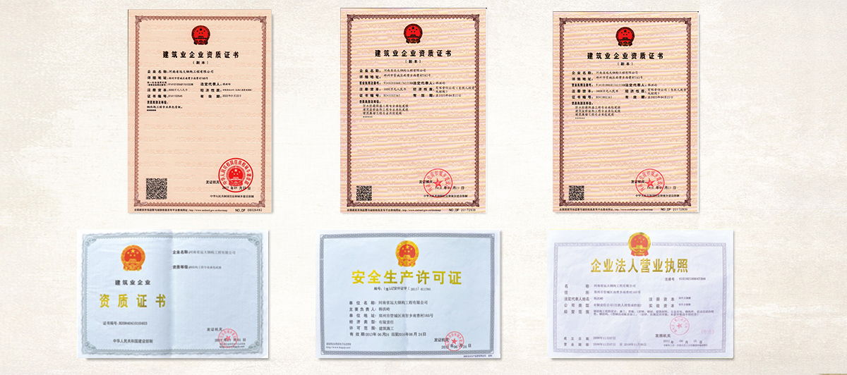 公司擁有“鋼結(jié)構(gòu)制造壹級(jí)”和“鋼結(jié)構(gòu)工程專業(yè)承包壹級(jí)”專業(yè)資質(zhì),獲得業(yè)內(nèi)認(rèn)可的各類專利及榮譽(yù)資質(zhì)證書(shū);公司及產(chǎn)品已通過(guò)了ISO9001質(zhì)量管理體系認(rèn)證和省級(jí)檢測(cè)、鑒定,安全耐用。